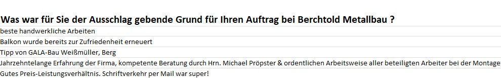 Was waren Ihre Gründe für einen Auftrag an das Team von Berchtold Metallbau GmbH? Die Antworten sind so vielfältig wie unsere Kunden und deren Metallbau-Visionen – von bereits guten Erfahrungen bei vorherigen Projekten bis zum guten Preis-Leistungsverhältnis und unsere Arbeitsweise ist alles dabei. Vielen Dank für die offenen Rückmeldungen!