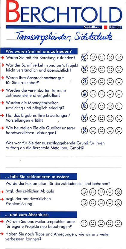 Wir freuen uns sehr über das positive Feedback aus unserer jüngsten Kundenbefragung! Besonders unsere Qualität und Termintreue wurden wieder hervorragend bewertet – ein großes Dankeschön an alle Teilnehmenden für das Vertrauen und die offenen Rückmeldungen.